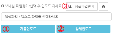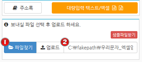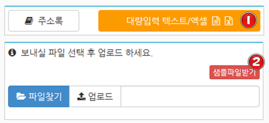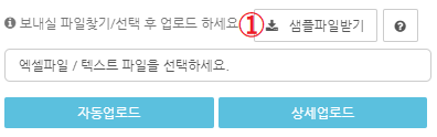 1번을 클릭하시면 하단에 파일을 업로드 할 수 있는 메뉴가 펼쳐지며, 2번 샘플파일을 다운받아 필요한 정보들을 입력하여 개별 발송을 위한 준비를 합니다.