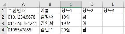 다운로드 한 샘플파일을 수신번호, 이름, 항목1, 항목2 순서대로 데이터를 입력합니다.