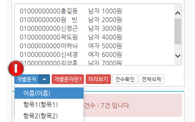 업로드가 완료 되면 수신번호, 이름, 항목1, 항목2 등 순으로 나열됩니다.